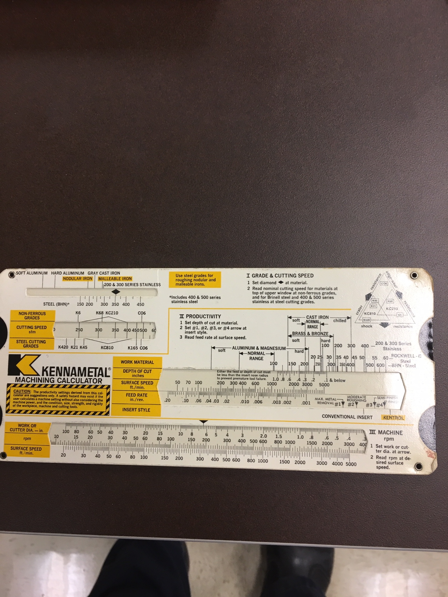 Many years ago, right after inserted carbide cutters were readily available and cemented tooling was slowly disappearing, we used slide or rotary calculators to determine RPM and feed rates. I found these two in my collection of useless nor longer used junk. As machinists we all had a slide calculator